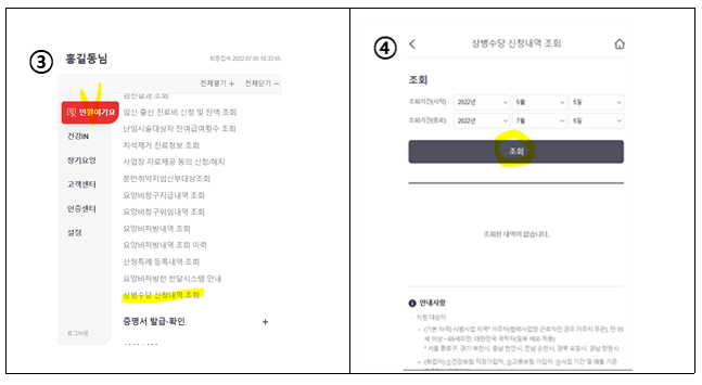 ▶ 모바일 앱 실행 - ①로그인 - ②하단 전체메뉴 - ③민원 여기요 - 상병수당 신청내역 조회 - ④신청진행상태 확인