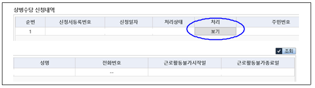 ▶ 민원 여기요 - 개인민원 - 보험급여 - 상병수당 신청화면 - '보기'를 선택하는 경우 기존 신청 세부내역 확인 가능