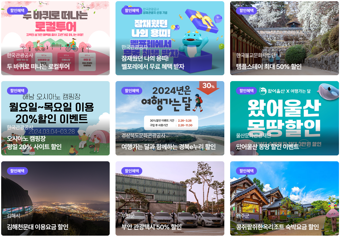 여행가는달에서 할인해주는 놀거리들은 관광지 입장 할인, 다양한 방문인증 이벤트 등 풍성한 혜택이 있습니다.