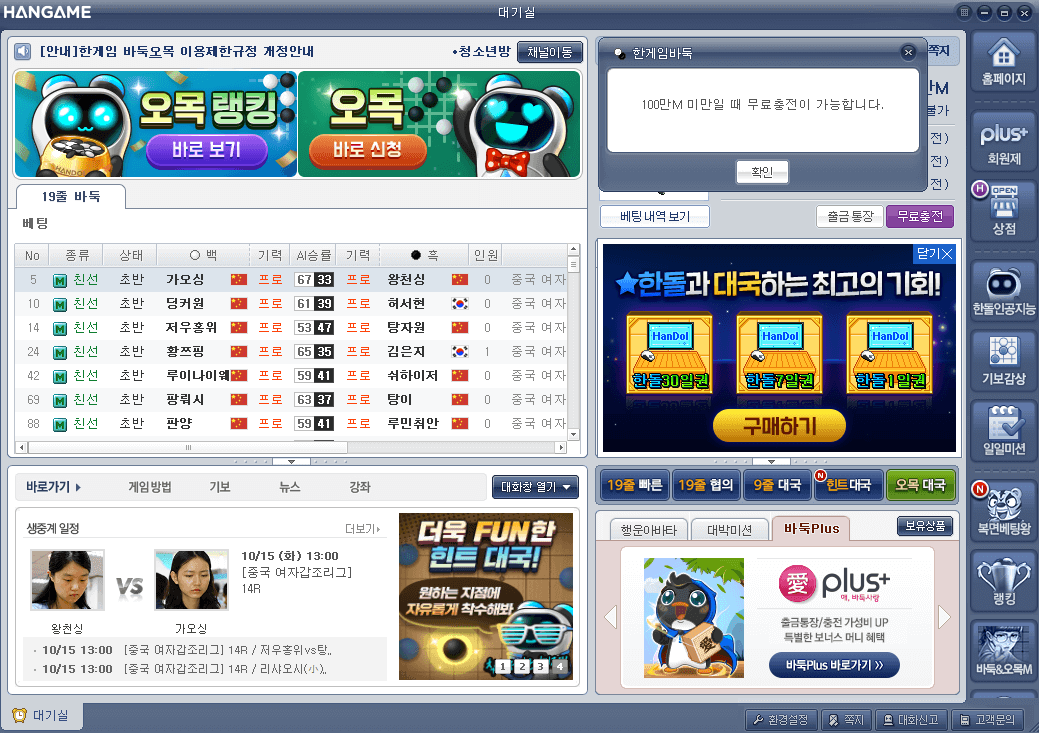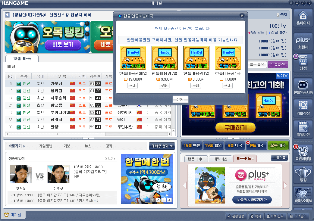 하지만, 한돌 이용권을 사용해야 해서 한돌 이용권 없이는 대국을 할 수 없습니다.