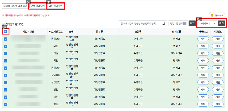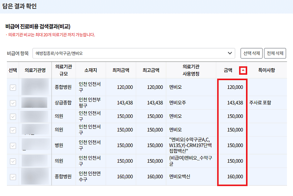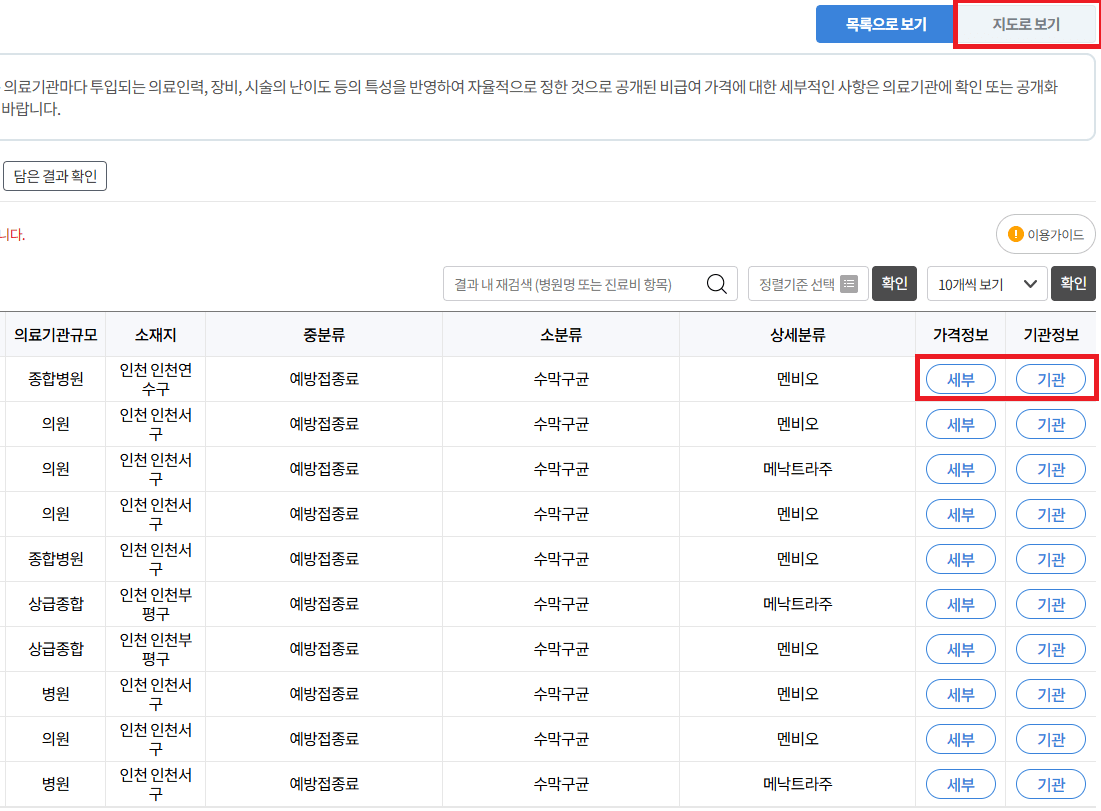 오름차순 또는 내림차순으로 정렬하면 한눈에 가격비교가 가능합니다. 기관별 특이사항도 확인한 후에 마음에 드는 의료기관에 방문하여 치료받으면 됩니다.