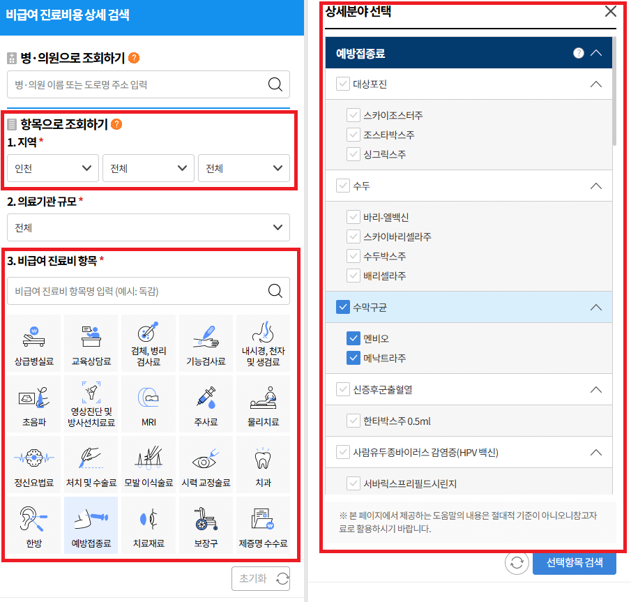 지역, 비급여 항목, 상세분야, 선택항목을 검색합니다.