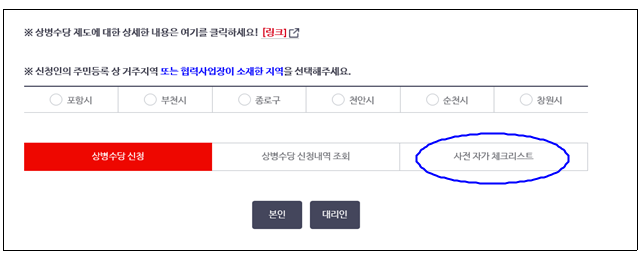 1. 상병수당 신청메뉴 : 민원 여기요 - 개인민원 - 보험급여 - 사전 자가 체크리스트